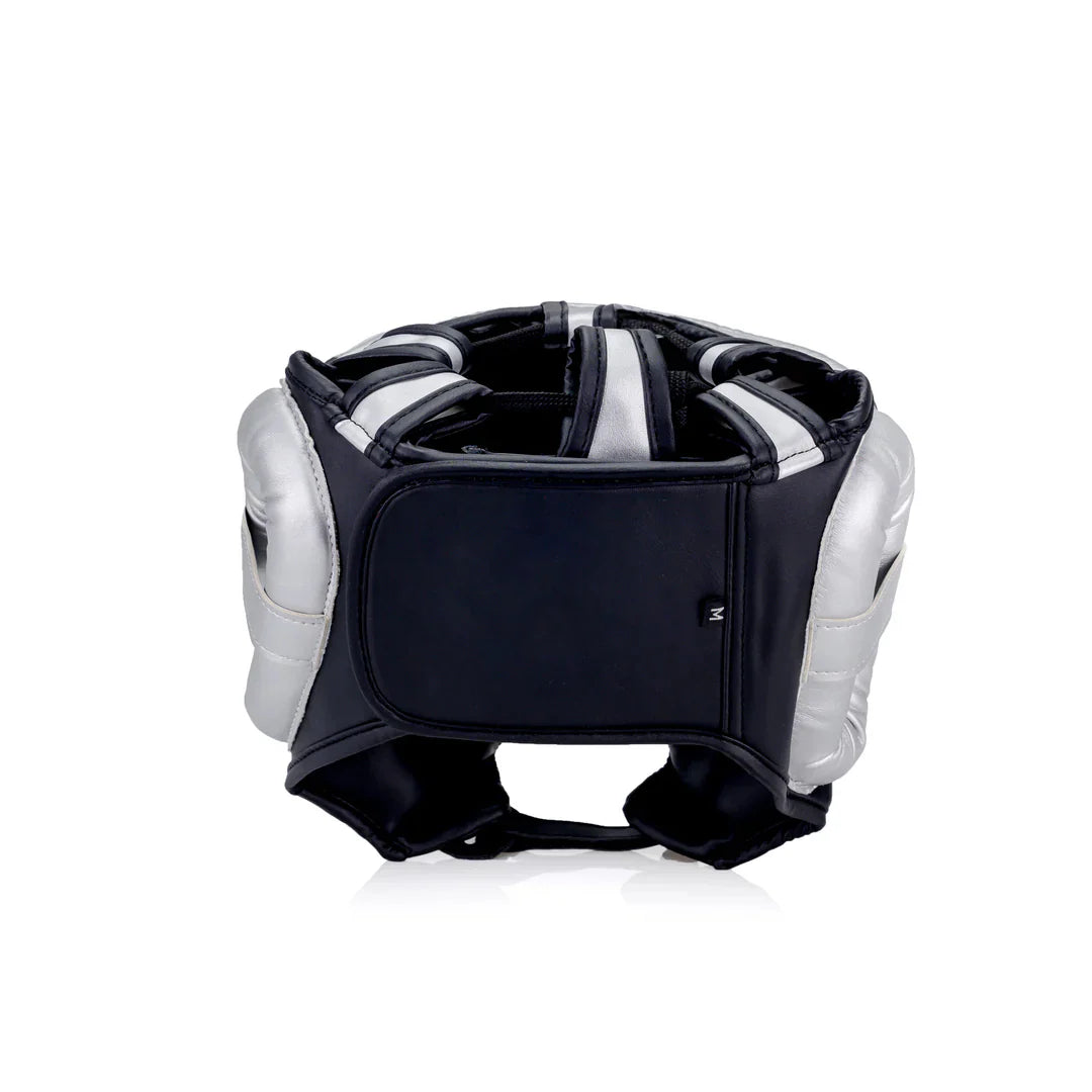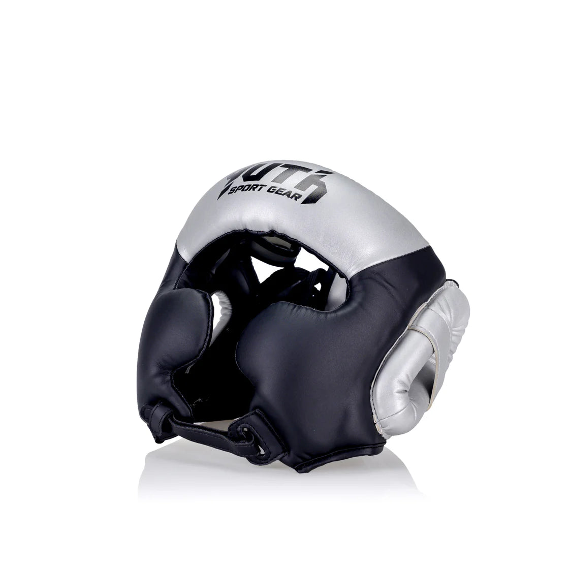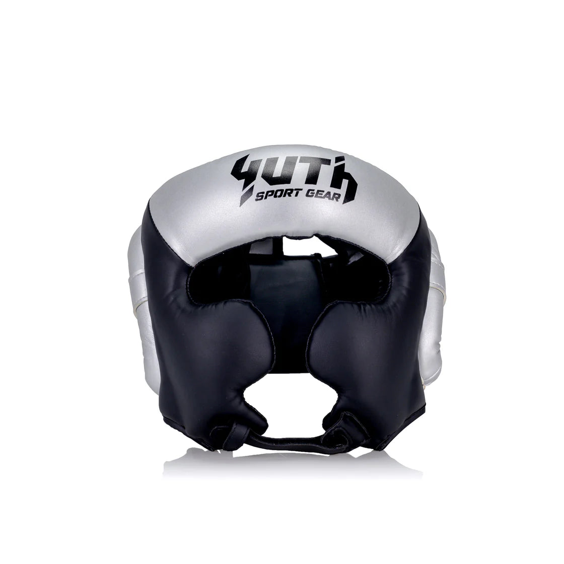 -Sparring Headgear Made With Semi Leather-Full Face Protection-High Cheek Bone Padding-Colors Available: Black/Silver
